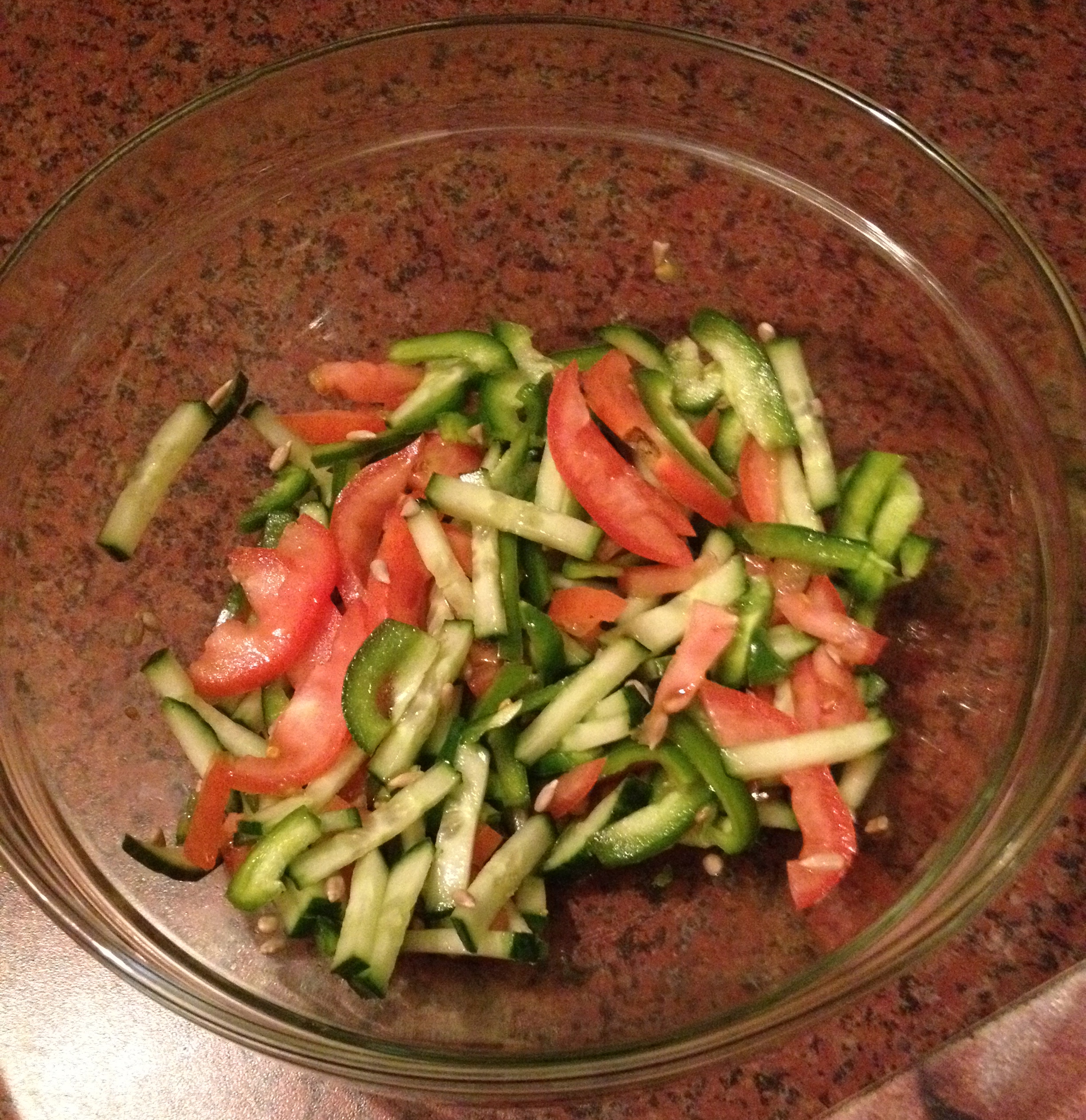 - In a mixing bowl, add the tomato, cucumber, green pepper and onion and mix.