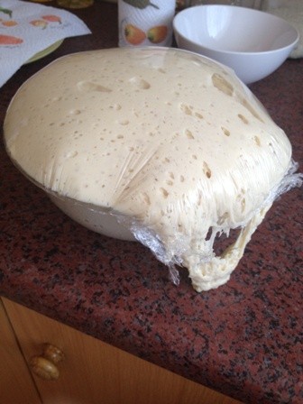 - Cover the bowl with plastic cover, let the dough rise for about an hour in a warm place (do not refrigerate).