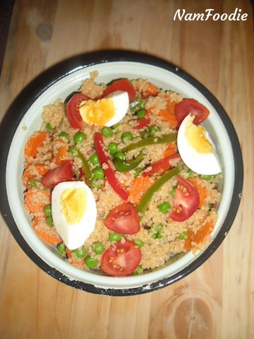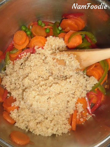- Remove the quinoa from the heat and mix in the veggies.