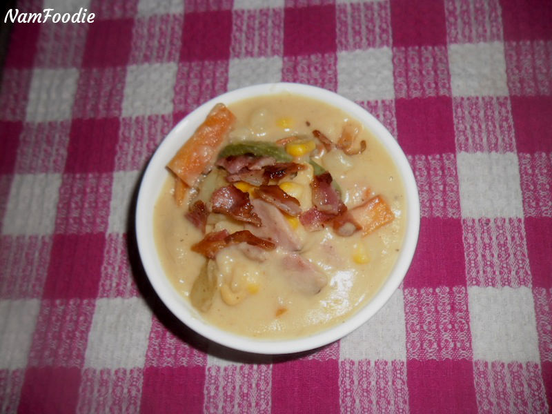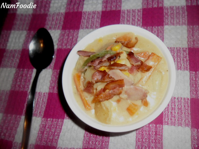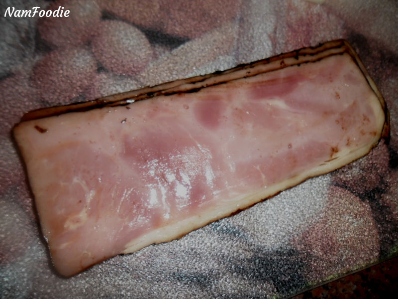5. Chop the beacon and ham and add into the cooking potatoes and turn off the heat and let simmer.