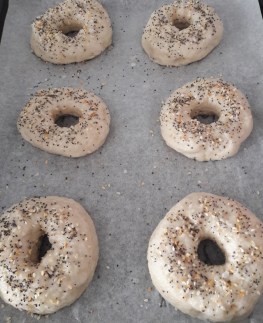 - knock the air out and place on a lightly oiled surface and divide into equal pieces (use a scale if you want to be precise). Makes 14-16 bagels.
