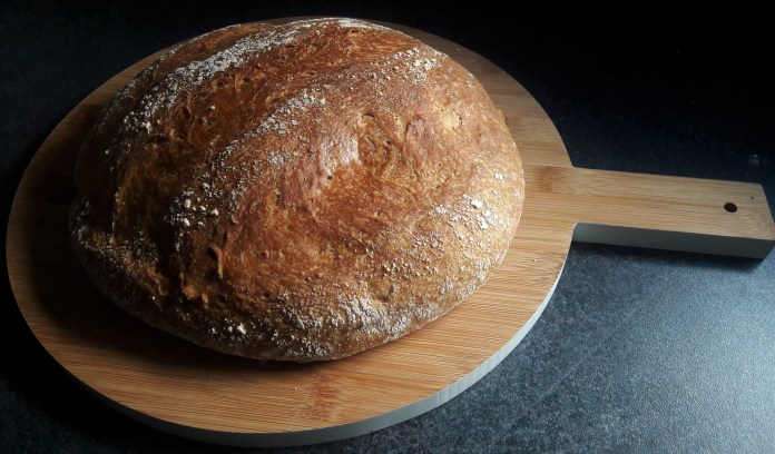 - Gently place the dough into a floured dutch oven, score the dough, reduce the oven to 200°C