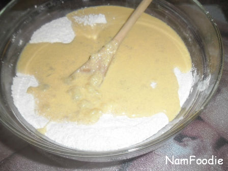 - In a separate bowl, add sugar, eggs, vanilla and buttermilk and mix well.