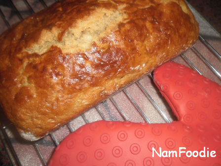 - Pour into a greased loaf pan and bake for 1 hour or when a toothpick inserted comes out clean.